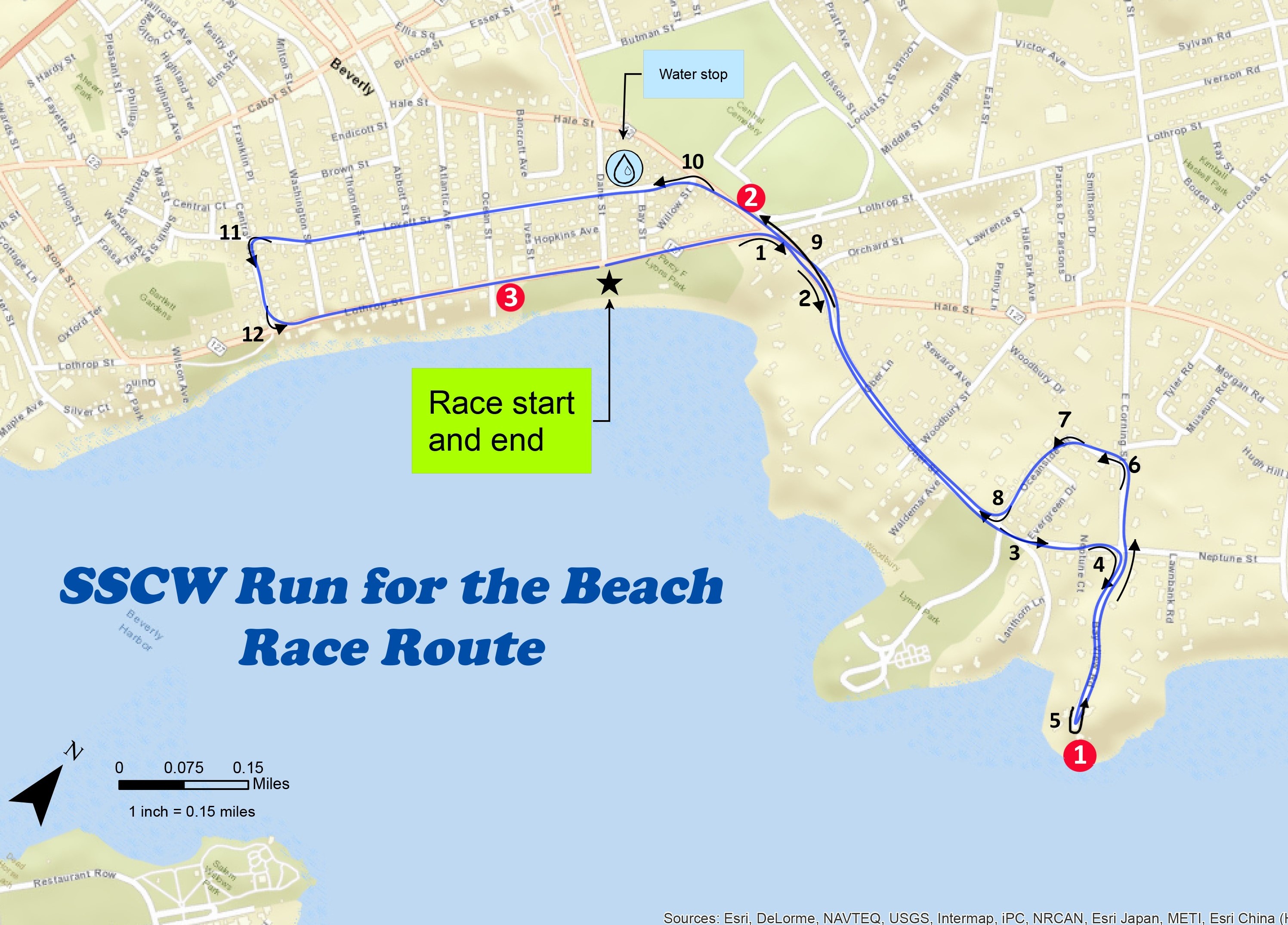 The 5K route starts at Dane Street Beach in Beverly, MA and goes past Lynch Park and the historic Hospital Point Lighthouse. It then circles back through residential streets and concludes at Dane Street Beach.
