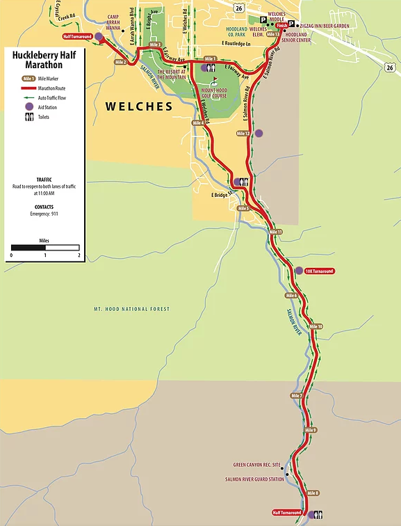 Half Marathon Route: At your own pace, you’ll delight in sights such as a golf course, the Cascade Range, the Salmon River, bridges and natural wildlife—where you might see deer! The Half Marathon route is the same as the 10k except it has an additional six-seven miles of running in the National Forest and crossing the Salmon River twice. This course is considered somewhat challenging with mixed rolling hills.