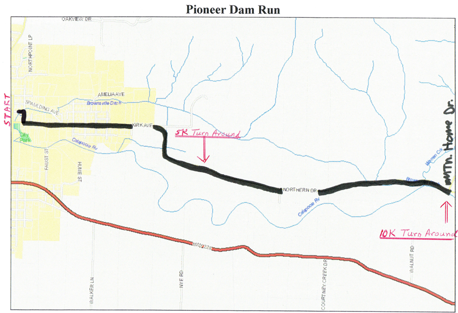 Both the 10K and 5K races start next to Linn County Historical Museum, following Kirk Ave and Northern Drive up the scenic Calapooia River Valley on a flat fast course. The 5K race turnaround is at approximately 1.5 miles along this route while the 10K course continues out to the historic site of the Brownsville Dam on the Calapooia River and returns back along the same route.